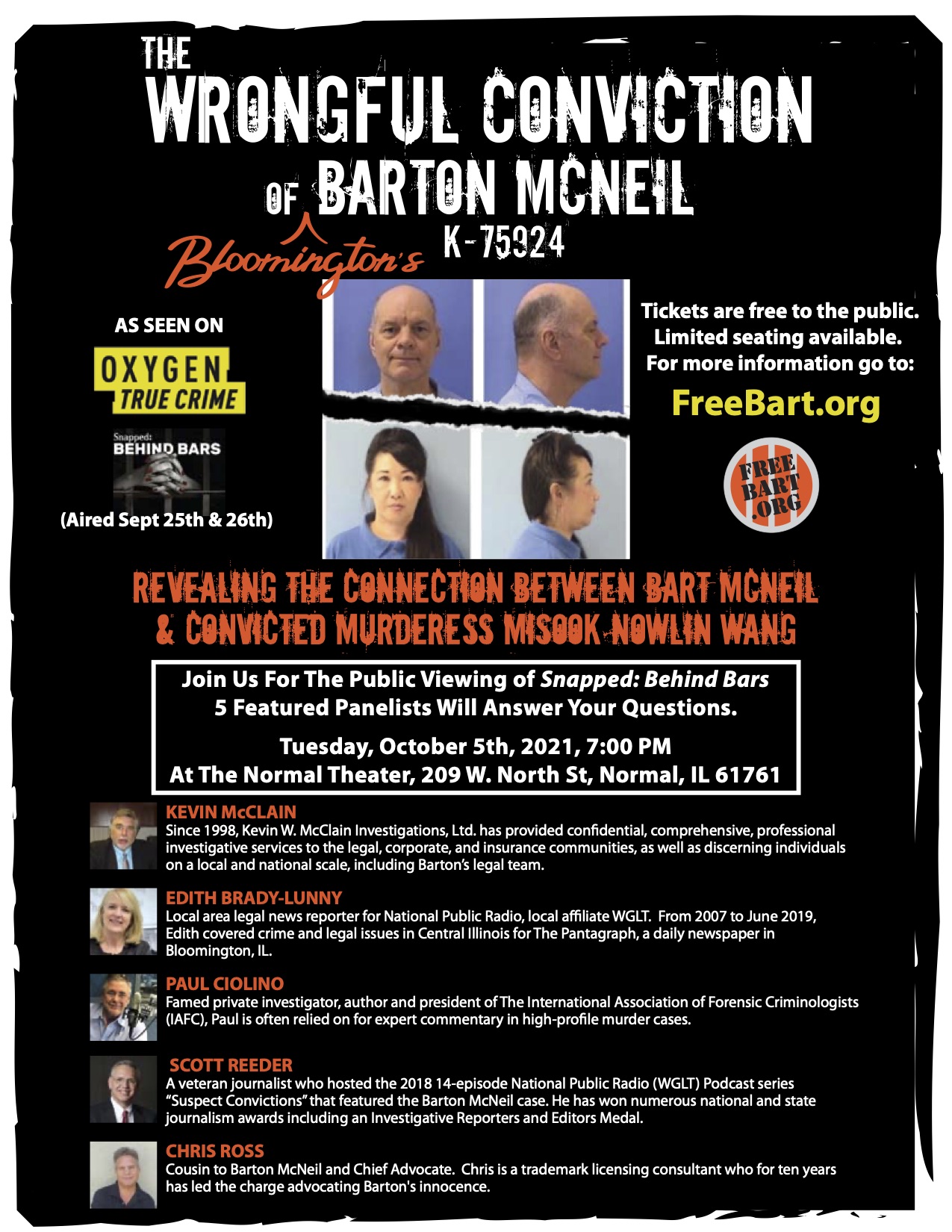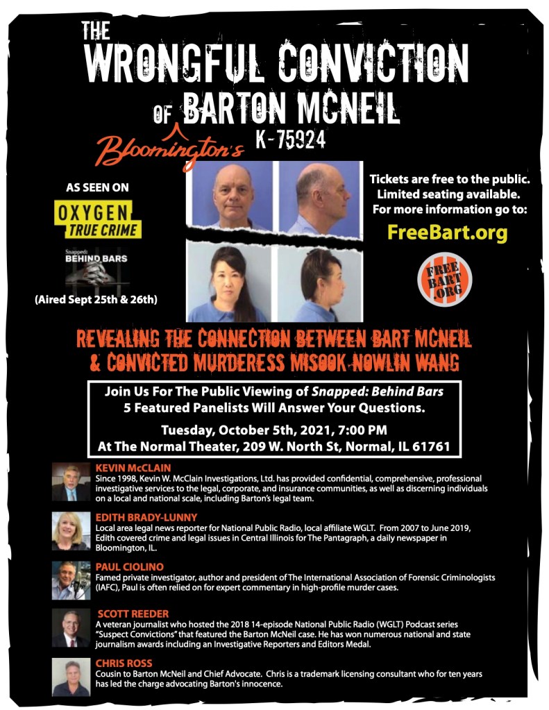 On Tuesday, October 5th, 2021 at 7:00 pm there will be a special live presentation and airing at the Normal Theatre, in Normal, IL, of the Oxygen Network’s 2-hour premiere special “Snapped: Behind Bars” chronicling the Barton McNeil and Linda Tyda murder cases. This will be followed by a live expert discussion among distinguished panelists, and we urge everyone to attend (See flyer for tickets).